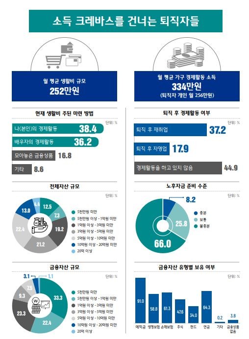 보고서에 따르면 퇴직자들은 생활비로 평균 월 252만원 지출하며, 3명중 2명은 생활비가 28.7% 줄었다. 이들은 괜찮은 생활수준을 위해 월 400만원 이상 필요하다고 봤다.