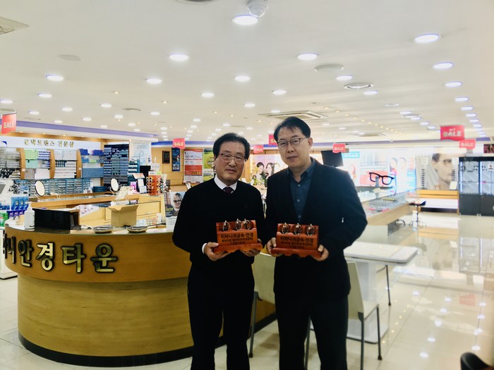 경기 수원시 팔달구 화서동에 위치한 '티파니안경타운'은 고등동 행정복지센터를 이용하는 노인들의 편의를 위해 11일 돋보기안경 2세트를 기탁했다. 사진은 관계자들이 기념촬영을 하는 모습. (사진제공=팔달구청)