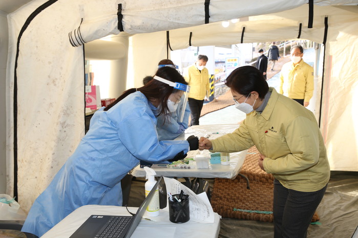 서울 은평구 불광천 은평춘당(어르신쉼터) 밑에 마련된 임시선별검사소에 ‘코로나19’ 검사를 받으려는 주민들의 행렬이 이어지고 있다. 사진은 임시선별검사소를 방문한 김미경 구청장(오른쪽)이 선별검사소 직원들을 격려하고 주먹 인사를 하고있는 모습. (사진제공=은평구청)