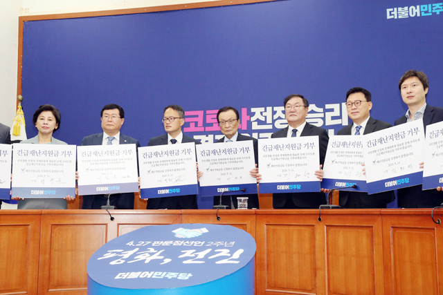 더불어민주당 이해찬 대표와 김태년 원내대표 등 의원들이 11일 오전 서울 여의도 국회에서 열린 최고위원회의에서 긴급재난지원금 기부 서약서를 들어 보이고 있다.