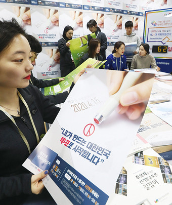 제21대 국회의원선거를 62일 앞둔 13일 오후 경기 수원시 경기도선거관리위원회에서 직원들이 총선 홍보 포스터를 살펴보고 있다.