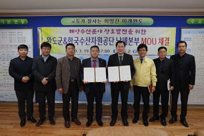 전남 완도군이 19일 한국수산자원공단 남해본부와 해양수산분야 상호 발전을 위한 업무협약을 체결하고 정책 공동개발 등에 힘을 모으기로 했다. 사진은 협약 후 신우철 군수(오른쪽에서 네 번째)와 민병주 본부장 등 관계자들이 기념촬영을 하는 모습. (사진제공=완도군청)