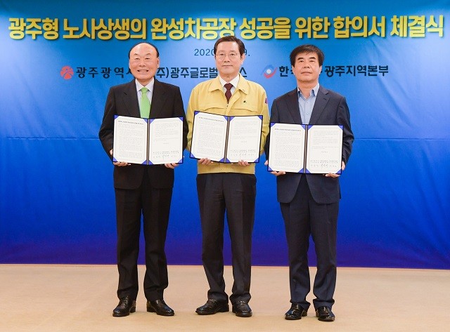 [광주=정찬남 기자] 광주광역시, ㈜광주글로벌모터스, 한국노총 광주지역본부는 상호 신뢰를 바탕으로 노동이 존중받고 기업하기 좋은 광주형일자리 완성차 사업의 성공을 위해 함께 노력키로 하고 3개항의 합의서를 채택했다.