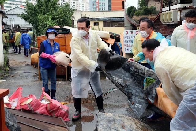 이용섭 시장도 시청 직원 및 자원봉사자 등과 함께 광산구 송정동 신덕마을에서 침수된 주택의 가재도구를 정리하고 쓰레기와 폐기물을 수거하는 등의 활동으로 복구에 힘을 보탰다.