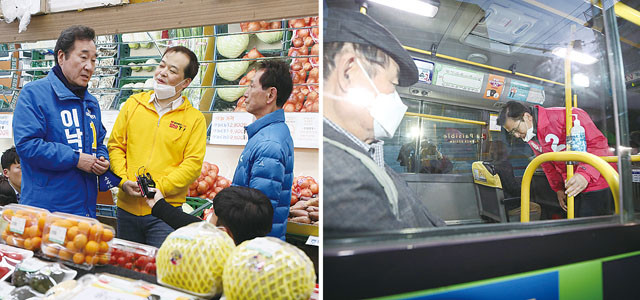 제21대 총선 선거운동이 공식적으로 시작한 2일 오전 서울 종로구에 출마한 더불어민주당 이낙연 후보가 종로구 우리마트에서 선거운동을 하고 있다(왼쪽). 제21대 국회의원 선거운동이 시작된 2일 오전 서울 종로구에 출마하는 미래통합당 황교안 후보가 종로구 옥인동 마을버스 종점에서 출근길 시민들에게 인사하고 있다.