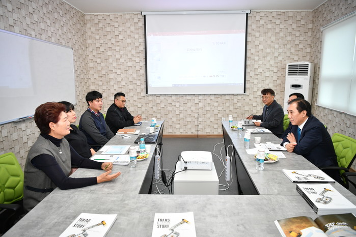 박윤국 경기 포천시장이 21일 이원웅 도의원, 기업지원과장, 안전총괄과장 등과 함께 가산면에 위치한 중소가구기업 (주)토파스를 방문해 기업애로를 청취하고 노고를 격려했다. 사진은 기업 관계자로부터 애로사항을 청취하고 있는 박 시장의 모습. (사진제공=포천시청)