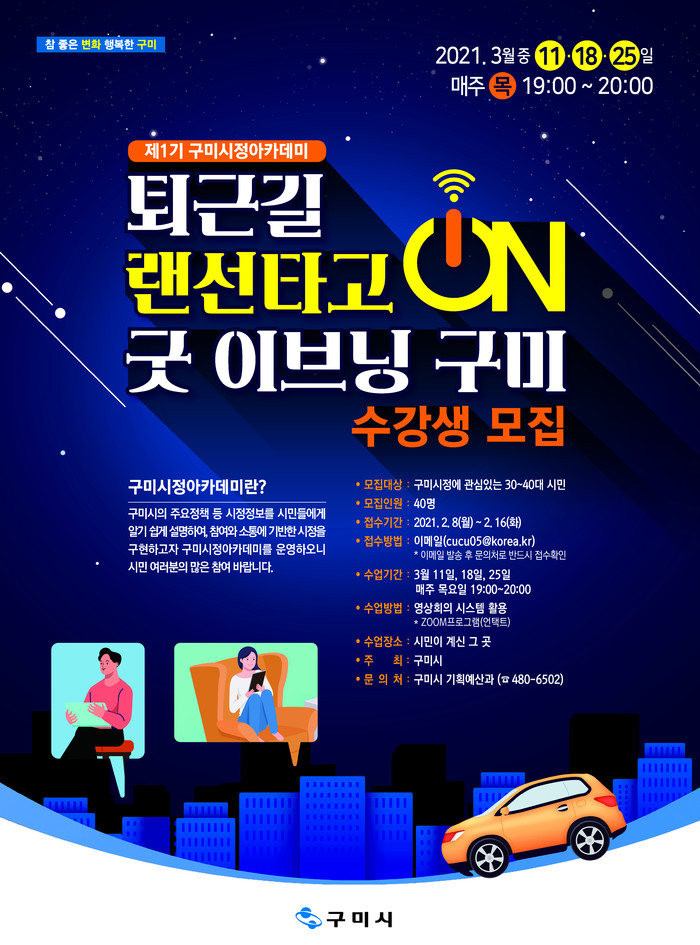 이번 제1기 구미시정아카데미는 시정참여가 대체로 낮은 30~40대 구미시민 40명을 대상으로 「퇴근길 랜선타고 ON 굿 이브닝 구미」 테마로 개강하며, 퇴근 후 여가시간을 활용해 집에서 구미의 이야기를 나누는 비대면 소통의 시간으로 만들어 갈 것이다.