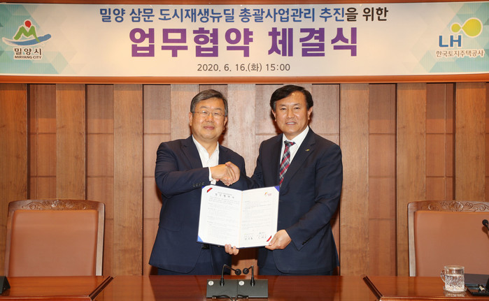 밀양시(시장 박일호)는 쇠퇴한 삼문동 구도심에 새로운 활력을 불어넣을 삼문동 도시재생 뉴딜사업을 한국토지주택공사(이하 LH) 경남지역본부와 협력하여 추진하기 위해 16일 총괄사업관리자 업무협약을 체결했다.