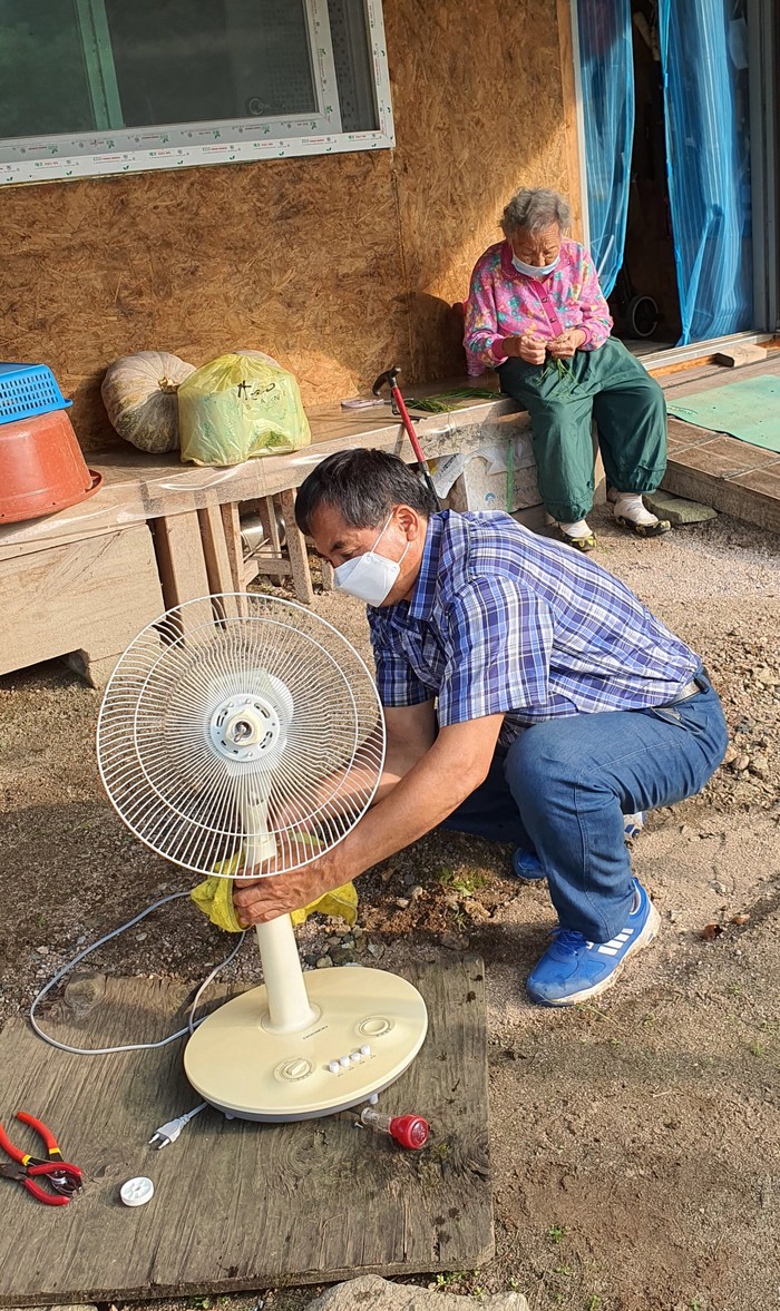 경기 양평군 서종면 지역사회보장협의체는 최근 지역내 홀몸노인 등 취약계층 60가구를 방문해 건강한 여름나기 물품 세트를 전달하고 여름내 사용한 선풍기를 세척·청소하는 봉사활동을 했다. 사진은 한 협의체 의원이 홀몸노인 가구에서 선풍기를 청소하고 있는 모습.(사진제공=양평군청)