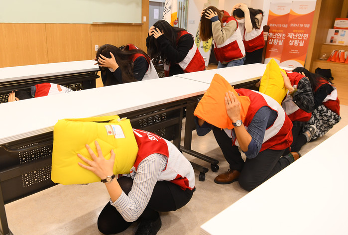12일 서울 마포구 희망브리지 전국재해구호협회에서 열린 지진 대응 훈련 '2020 쉐이크아웃(ShakeOut) 코리아'에서 관계자들이 지진 발생 상황을 가정해 훈련을 하고 있다.