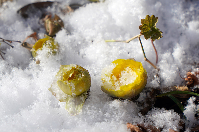 함박눈이 내린 28일 오후, 하늘이 숨겨둔 천장산 숲길에 자리하고 있는 서울 동대문구 산림과학원 홍릉수목원에 봄의 전령사로 널리 알려진 복수초가 수줍게 피었다. 사진은 홍릉수목원에 피어난 ‘복수초’의 모습. (사진제공=동대문구청)