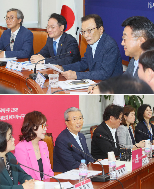더불어민주당 이해찬 대표가 23일 국회에서 열린 시도당위원장 연석회의에서 발언하고 있다(위). 미래통합당 김종인 비상대책위원장(가운데)이 23일 국회에서 아동학대범죄 근절을 위한 전문가 간담회에서 발언하고 있다.