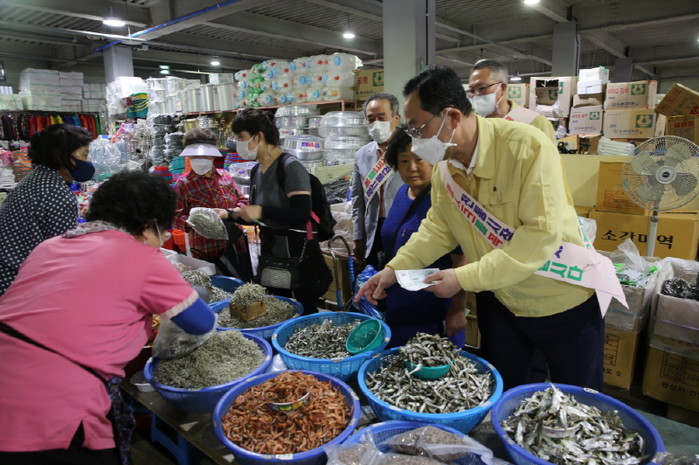 명현관 군수가 지역내 시장에서 해남사랑상품권을 이용해 물품을 구입하는 모습. (사진제공=해남군청)