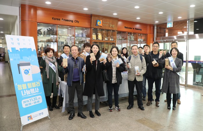 경기 안성시는 22일 오전 생활속 청렴의식을 함양하고 친환경적 사무실 문화를 만들기 위해 공직자를 대상으로 한 ‘청렴 텀블러 나눔행사’를 열었다. 사진은 행사에 참여한 관계자들이 기념촬영을 하는 모습.(사진제공=안성시청)