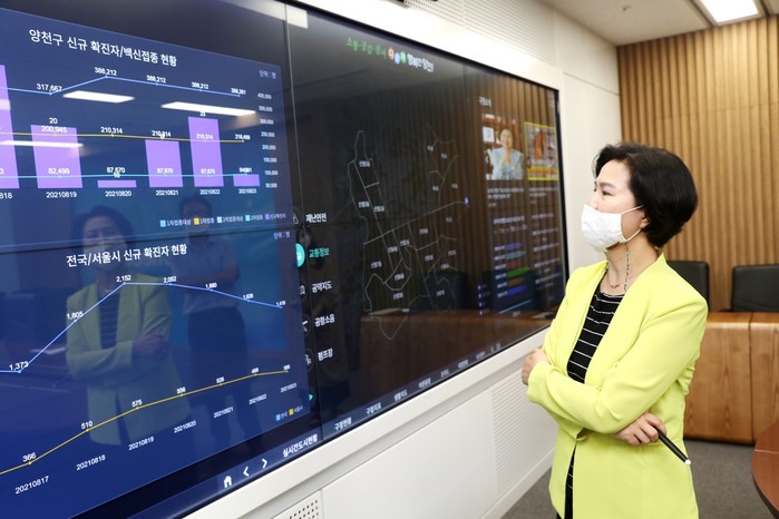 | ▲ 스마트맵에서 코로나현황을 확인하는 김수영 구청장. (사진제공=양천구청) |