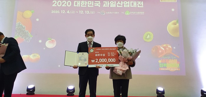 이번 대표과일 선발대회 시상식은 지난 4일 세종시 컨벤션센터에서 개최한‘2020 대한민국 과일산업대전’개막식 행사에서 치러졌으며, 수상한 과일은 오는 13일까지 온라인 전시회에서 만나 볼 수 있다.