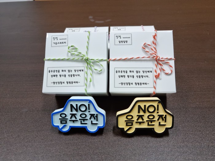 양산경찰서 청렴동아리(회장 김종돈)는 코로나19 확산으로 시민들이 어려움을 겪고 있는 시기에 모범을 보여야 할 경찰관이 음주운전을 했을 경우 시민의 신뢰도가 떨어지는 것을 예방하기 위해 “NO! 음주운전!” 문구가 새겨진 차량용 방향제를 제작·배부하였다.