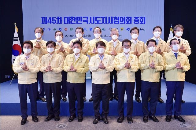 | ▲ (앞줄 왼쪽부터) 이철우 경북도지사, 이춘희 세종시장, 원희룡 제주지사, 권영진 대구시장, 이시종 충북도지사, 김영록 전남도지사, 송철호 울산시장. 윗줄 왼쪽부터 최문순 강원도지사, 박원순 서울시장, 이용섭 광주시장, 송하진 전북도지사, 이재명 경기도지사, 허태정 대전시장, 김경수 경남도지사, 변성완 부산시 행정부시장.(사진제공=광주광역시) |