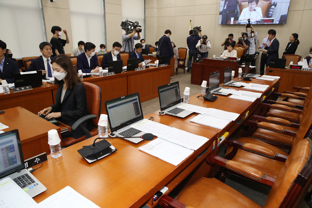 미래통합당 의원들이 28일 법안상정에 반대하며 서울 여의도 국회에서 열린 행정안전위원회 전체회의에 불참하고 있다.