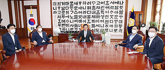 박병석 국회의장이 20일 오전 서울 여의도 국회에서 열린 국회의장-여·야 원내대표 회동에서 발언하고 있다. 왼쪽부터 더불어민주당 김영진 원내수석부대표, 김태년 원내대표, 박병석 국회의장, 미래통합당 주호영 원내대표, 김성원 원내수석부대표.