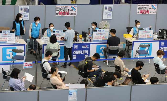 13일 오후 서울 송파구 체육문화회관에 설치된 송파구 백신접종센터에서 시민들이 코로나19 백신 접종을 받은 뒤 이상반응 모니터링을 위해 대기하고 있다. 정부가 내달 초 '단계적 일상회복'으로의 방역 체계 전환을 예고한 가운데, 국내 코로나19 백신 접종 속도가 빨라지면서 기존 일정이 앞당겨질 수 있다는 전망이 나왔다. 이날 정부 관계자에 따르면 방역 체계 전환의 기준이 되는 '전 국민 접종완료율 70%' 목표 달성 시점이 정부가 예상한 이달 23일보다 더 빨라질 가능성이 있는 것으로 나타났다.