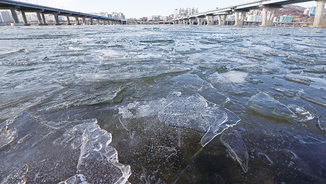 7일부터 사흘간 매서운 한파가 절정에 이른다. 기상청은 5일 '추위 발생원인 및 전망'을 주제로 한 온라인 미니브리핑을 열어 7∼9일 중부 지방을 중심으로 기온이 영하 20도까지 떨어지겠다고 밝혔다. 8일 예상 최저기온은 서울·수원 영하 17도, 춘천 영하 23도, 세종 영하 18도, 전주 영하 14도, 부산 영하 12도, 제주 영하 1도이다. 서울의 경우 2000년 이후 하루 최저기온이 가장 낮았던 때는 2001년 1월15일 영하 18.6도이다. 2016년 1월24일 영하 18도, 2018년 1월26일과 2011년 1월16일 영하 17.8도 등도 기록적인 강추위로 꼽힌다. 서울·경기 등 수도권 지역에 한파 특보가 내려진 가운데 5일 오후 서울 광나루 한강공원 앞 강물이 얼어 있다.