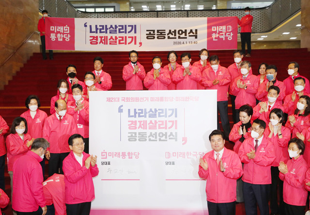 미래통합당 황교안 대표와 비례위성정당인 미래한국당 원유철 대표가 1일 국회 로텐더홀 홀 앞 계단에서 열린 ‘나라 살리기·경제살리기’ 공동 선언식에서 공동 서명한 후 박수치고 있다.