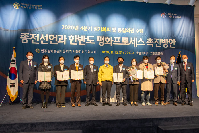 한용대 서울 강남구의회 의장은 최근 호텔프리마 그랜드볼룸에서 열린 ‘민주평화통일자문회의 강남구협의회 4분기 정기회의’에 참석했다. 사진은 한 의장(왼쪽)과 주요 참석 인사들이 기념촬영을 하고 있는 모습. (사진제공=강남구의회)