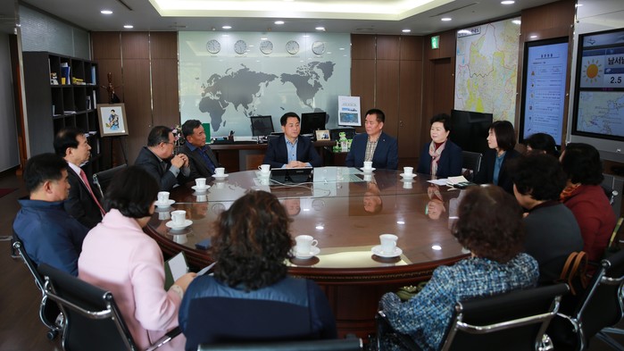 경기 수원시 장안구는 지난 30일 구청장 집무실에서 각동 지역사회보장협의체 민간위원장과 간담회를 열었다. 사진은 이병규 구청장(가운데)이 민간위원장들과 복지서비스 실행방안을 논의하고 있는 모습.(사진제공=장안구청)