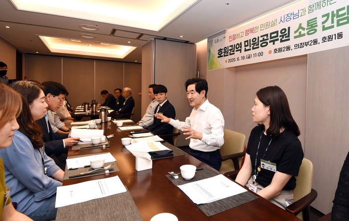 경기 의정부시 호원권역은 19일 안병용 의정부시장 주재로 민원담당 공무원의 사기 진작을 위한 소통간담회를 개최했다. 사진은 간담회에 참석한 안 시장이 공무원들과 이야기를 나누는 모습. (사진제공=의정부시청)