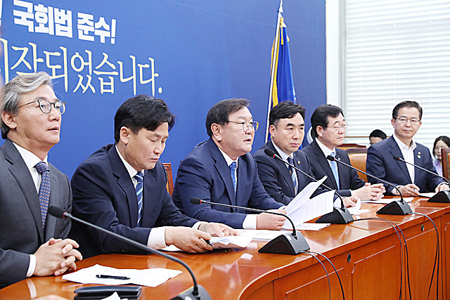 더불어민주당 김태년 원내대표는 국회법상 국회의장단 선출시한(5일)을 하루 앞둔 4일 “민주당은 하늘이 두 쪽 나도 내일 본회의를 반드시 열겠다”고 말했다. 김 원내대표는 정책조정회의에서 이같이 천명하고 “어떤 장애도 새 국회를 향한 전진을 막지 못할 것”이라며 “민주당은 내일 본회의를 일하는 국회로 나아가는 첫 걸음으로 삼겠다”고 말했다.