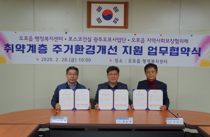 경기 광주시 오포읍행정복지센터는 28일 포스코건설 광주오포사업단, 오포읍 지역사회보장협의체와 함께 지역내 취약계층 주거환경 개선 지원을 위한 업무협약을 체결했다. 사진은 3개 기관 관계자들이 협약서를 들고 기념촬영을 하는 모습. (사진제공=광주시청)