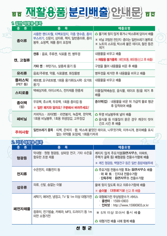 군은 종이류와 캔·고철류, 플라스틱, 폐비닐 등 일반 재활용 품목을 비롯해 형광등과 전지, 폐전자제품 등 기타 재활용 품목의 상세한 배출요령이 담긴 안내문을 제작해 배포한다.