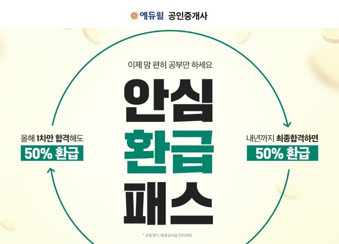 [시민일보 = 황혜빈 기자] 종합교육기업 에듀윌(대표 박명규)은 공인중개사 시험 준비생들이 시험공부에만 집중할 수 있도록 설계한 ‘공인중개사 안심환급패스’를 선보인다고 밝혔다.
