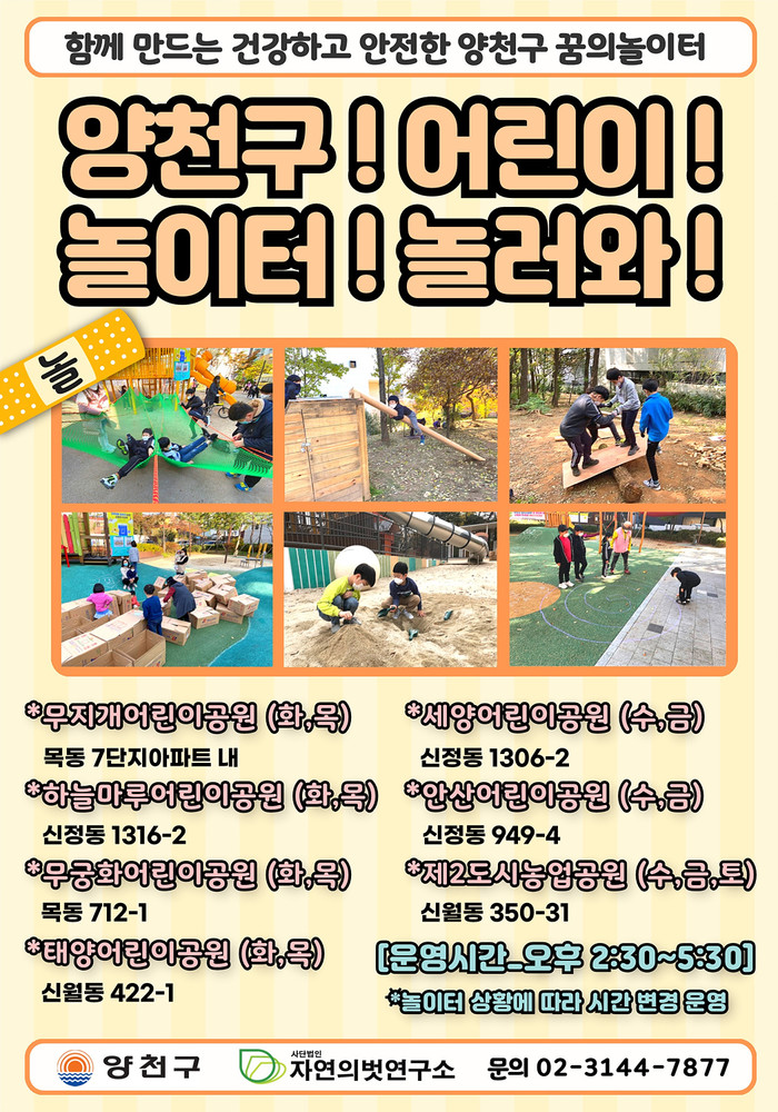 놀이활동 프로그램이 운영되는 꿈의 놀이터는 ▲무지개 어린이공원(목동7단지 아파트 내) ▲무궁화 어린이공원(목동 712-1) ▲제2도시농업공원(신월동 350-31) ▲태양 어린이공원(신월동 422-1) ▲하늘마루 어린이공원(신정동 1316-2) ▲안산 어린이공원(신정동 949-4) ▲세양 어린이공원(신정동 1306-2) 내 모험놀이터까지 총 7곳이다.