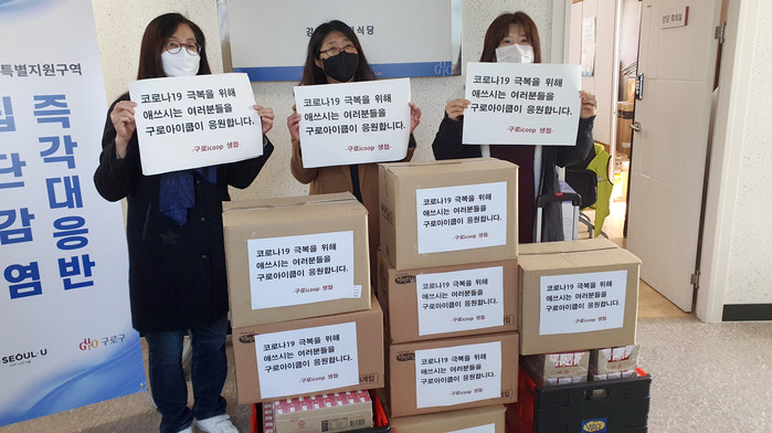 ‘코로나19’ 확산을 막기 위해 노력하는 서울 구로구보건소에 간식·마스크·치킨·홍삼 등 주민들의 따뜻한 온정의 손길이 이어지고 있다. 사진은 보건소 직원들을 위해 간식을 기증한 구로icoop생협 직원들의 모습.(사진제공=구로구청)