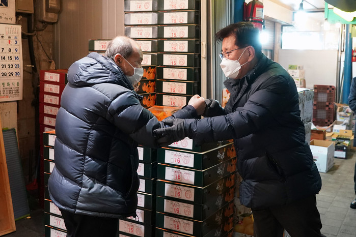 유덕열 서울 동대문구청장이 설 명절을 맞아 지난 1일부터 청량리청과물시장·청량리종합시장을 시작으로 지역내 전통시장을 방문해 코로나19 장기화로 어려움을 겪고 있는 상인들을 격려했다. 사진은 유 구청장(오른쪽)이 시장 상인들과 반갑게 인사를 하고 있는 모습.(사진제공=동대문구청)