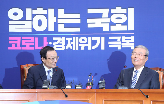 더불어민주당 이해찬 대표(왼쪽)가 3일 국회 당 대표실에서 예방 온 미래통합당 김종인 비상대책위원장과 웃으며 대화하고 있다.