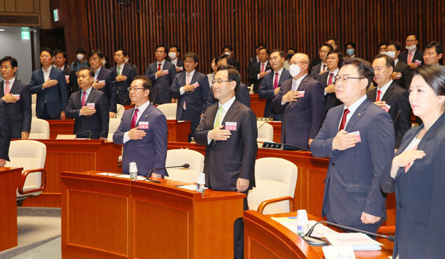 미래통합당 주호영 원내대표, 이종배 정책위의장과 제21대 국회의원 당선자들이 21일 국회 예결위회의장에서 열린 당선자 워크숍에서 국민의례 하고 있다.