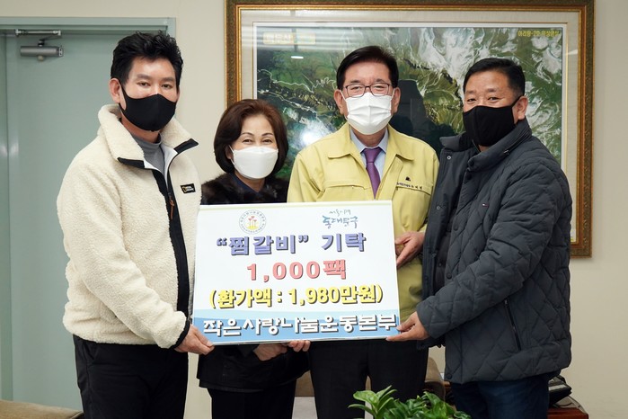 서울 동대문구는 (사)작은사랑나눔운동본부로부터 설을 맞아 어려운 이웃을 위한 찜갈비 1000팩(환가액 1980만원)를 전달받았다. 사진은 전달식에서 유덕열 구청장(오른쪽에서 두 번째)이 관계자들과 기념촬영을 하고 있는 모습.(사진제공=동대문구청)
