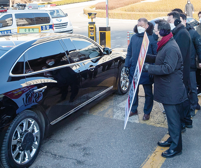국민의힘 주호영 원내대표가 8일 오전 서울 서초구 대법원 앞에서 출근하는 김명수 대법원장 차량을 향해 사퇴 촉구 피켓 시위를 하고 있다.