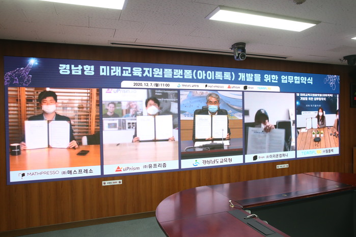 이날 업무협약은 ‘톡톡 유프리즘’을 활용하여 온라인으로 진행됐다. 참여기업인 ㈜매스프레소(공동대표 이종흔 이용재), ㈜유프리즘(대표 차민수), ㈜이리온컴퍼니(대표 김은광), ㈜팀플백(대표 이진희)은 경남교육청과 공동으로 교과 수업지원과 원격 화상수업지원 시스템을 지능형으로 연구·개발한다.