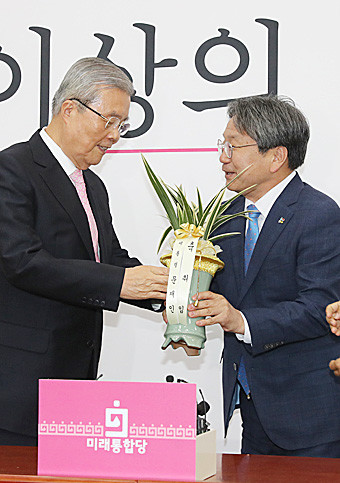 미래통합당 김종인 비상대책위원장(왼쪽)이 2일 오후 서울 여의도 국회에서 강기정 청와대 정무수석의 예방을 받고 문재인 대통령의 취임 축하 난을 전달받고 있다.
