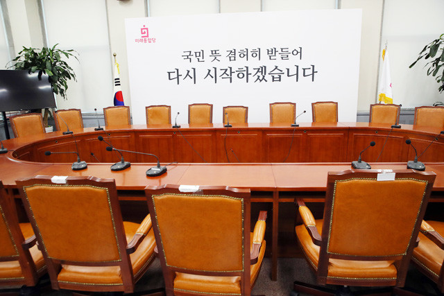 제21대 국회의원 선거에서 참패한 뒤 당 수습방안에 대한 이견으로 미래통합당이 혼란을 겪고 있다. 21일 국회 미래통합당 대회의실에 ‘국민 뜻 겸허히 받들어 다시 시작하겠습니다’ 배경지 문구와 당 깃발이 놓여 있다.