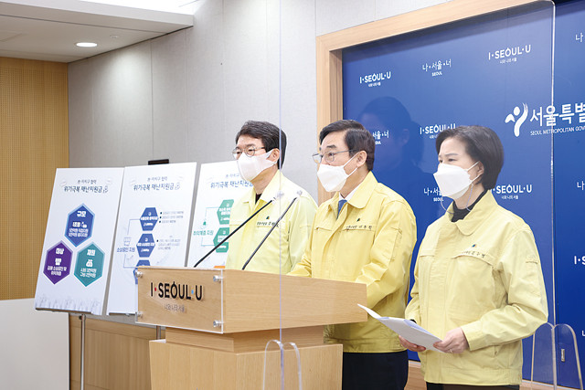 22일 오전 서울 중구 서울시청 브리핑룸에서 열린 ‘시-자치구 협력 위기극복 재난지원금 설명회’에서 구청장협의회장인 이동진 도봉구청장(가운데)과 정원오 성동구청장(왼쪽), 김수영 양천구청장이 지원금 지급 계획을 발표하고 있다.