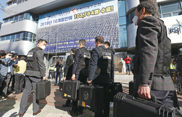12일 오전 대구 남구에 위치한 신천지교회(대구교회) 행정조사를 하기 위해 경찰 디지털 증거분석팀이 건물로 들어서고 있다.