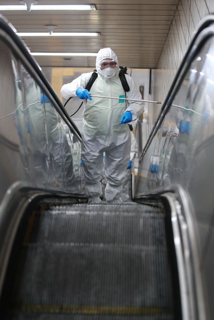 18일 오후 국내 29번째 신종 코로나바이러스 감염증(코로나19) 환자의 거주지인 서울 종로구 내 동묘역에서 보건소 보건위생과 감염관리팀 관계자들이 방역 작업을 하고 있다.