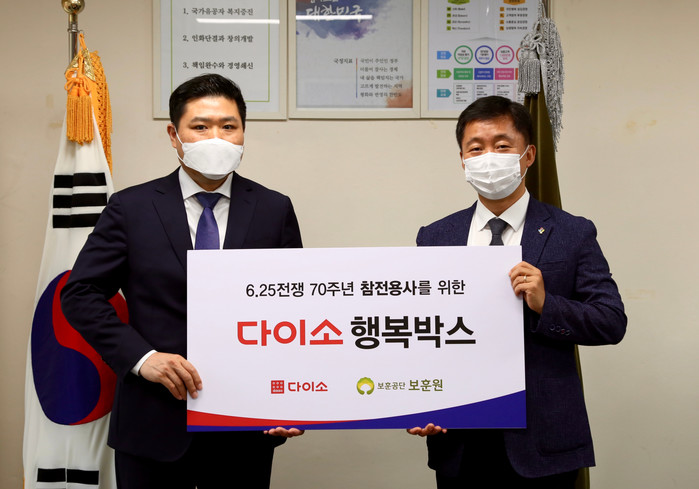 [시민일보 = 여영준 기자] 아성다이소가 6.25 전쟁 70주년과 6월 호국보훈의 달을 기념해 한국보훈복지공단 산하 보훈원과 보훈복지타운에 행복박스 500여개와 공기정화 화분을 25일 전달했다.