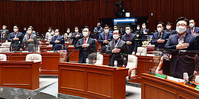 국민의힘 주호영 원내대표와 의원들이 19일 국회에서 열린 의원총회에서 국기에 대한 경례를 하고 있다.