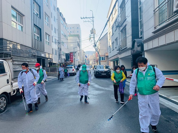 경기 이천시 창전동이 코로나19 확산 방지를 위해 매주 수요일을 '집중 방역의 날'로 정하고 최근 동 새마을남·녀협의회와 통장단협의회와 함께 이수흥 공원과 심포니공원, 창전동 골목길 등 시민들이 자주 찾는 곳을 중심으로 소독했다. 사진은 방역활동 모습. (사진제공=이천시청)